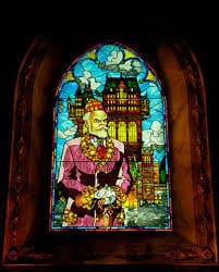 ㉗建物正面から見たアーチ状の4つの窓の部分の右から2番目のアーチの頂点部分に「ハイタワー三世」の顔の浮彫の石板が設置されている。