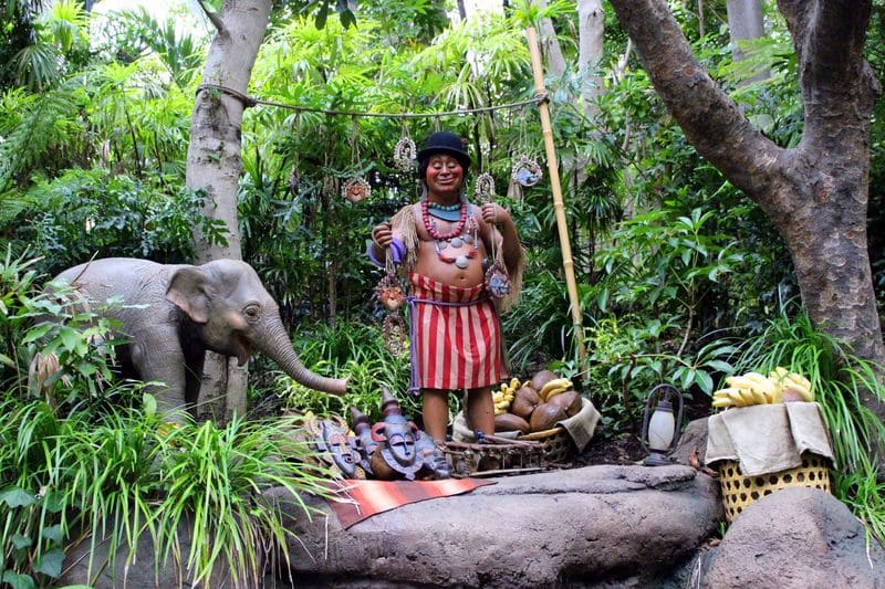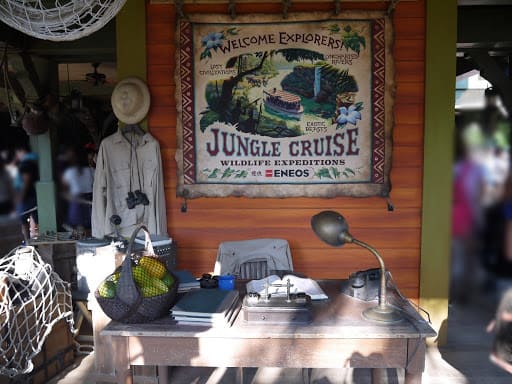 ⑤リニューアル前は、船の乗り場までのプレショーエリアに貿易会社時代のものと思われる名残の品があったが、リニューアル後はジャングル探検の長い実績から、探検の品々や船長の人柄の分かる展示になっている。