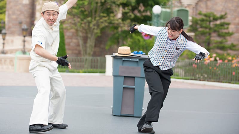 パーク内の清掃キャストに扮して、不思議なパフォーマンスをする。