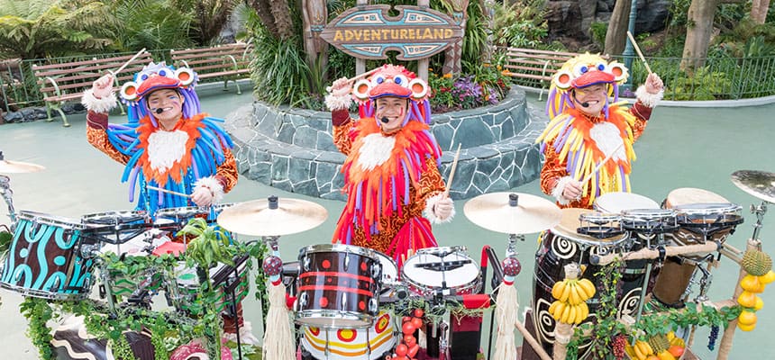 アトラクションやイベントのバックグラウンドストーリー、見どころを音楽やパントマイムを交えて紹介する3人組。