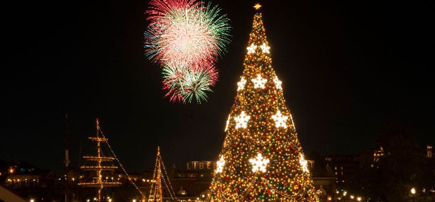 クリスマスソングに合わせて、星やベルの形の花火やクリスマスカラーの華やかな花火が打ち上がり、夜空を華麗に彩る。