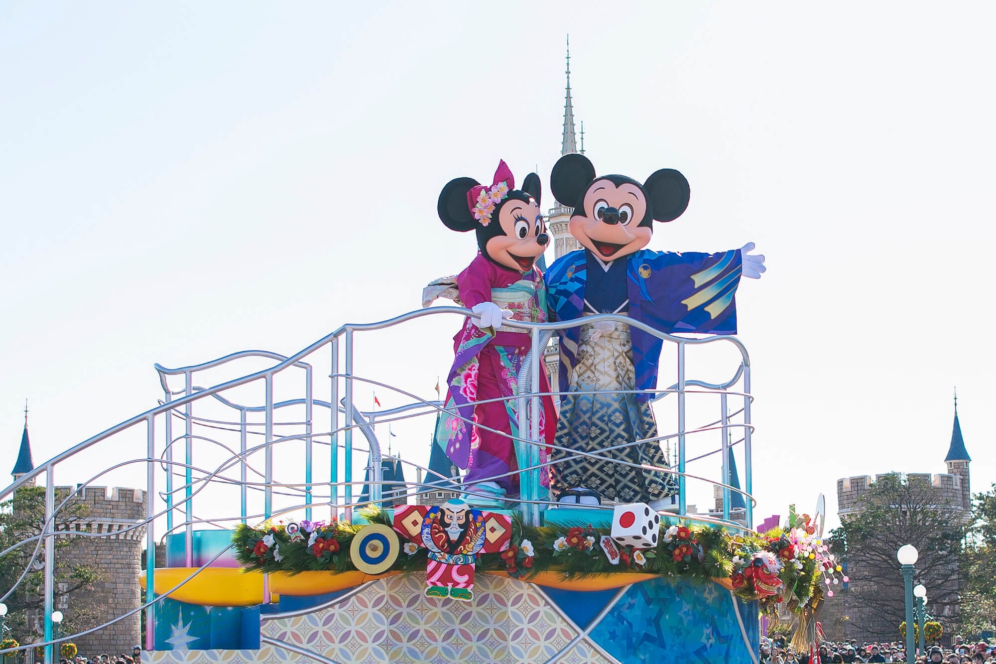 ミッキーマウス をはじめとするディズニーの仲間たちが、着物姿で、正月ならではの飾り付けが施されたフロートや車に乗って、新年の始まりをお祝い。