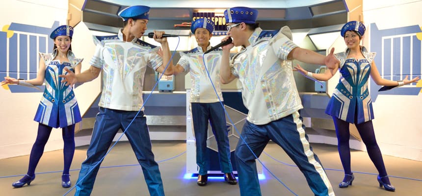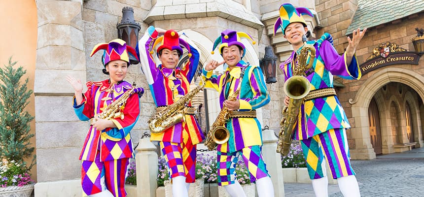 アトラクションやイベントのバックグラウンドストーリー、見どころを音楽やパントマイムを交えて紹介する3人組。