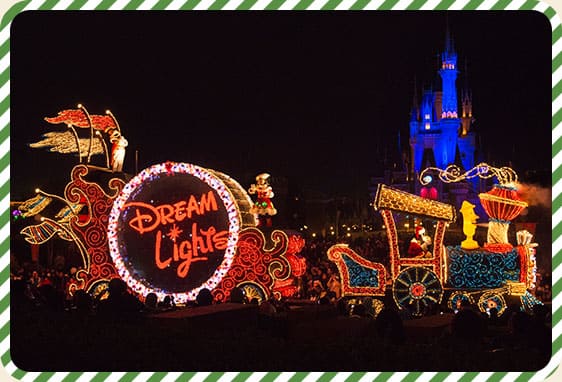 音と光のきらびやかな夜のパレードもクリスマスバージョンに。