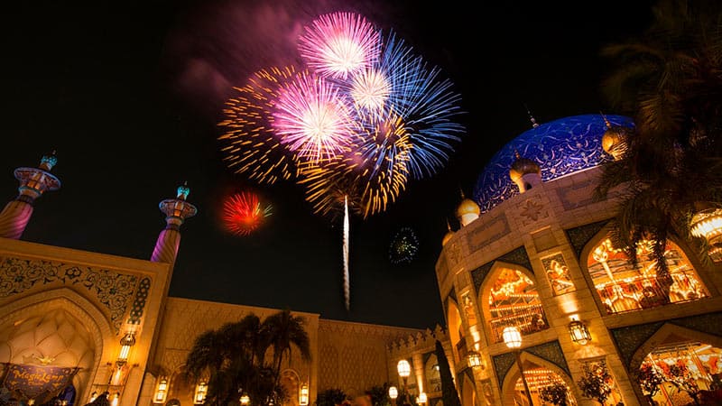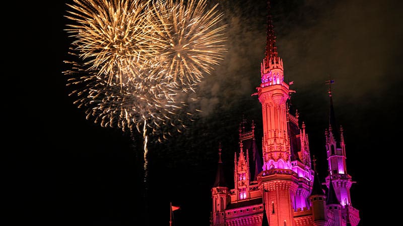 40周年のテーマソングやさまざまなディズニーソングにのせて、色とりどりの花火が夜空に咲き誇る。
