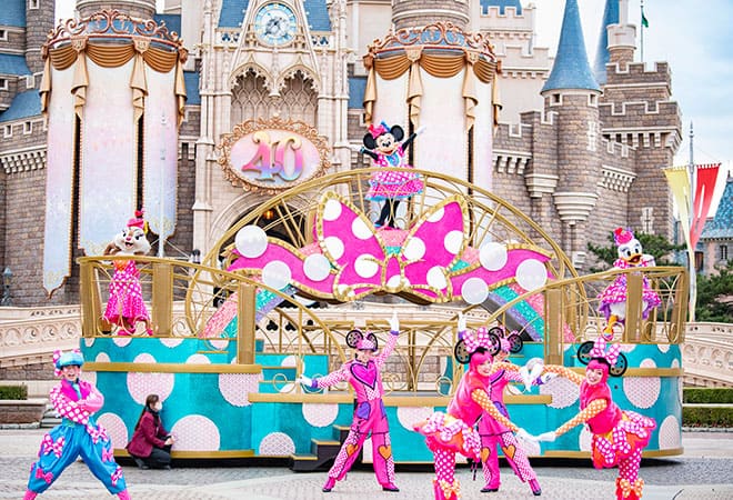 ハートのアクセサリーやラブリーなドット柄で彩られたとびきりキュートなコスチュームを身にまとったミニーと仲間たちが、大きなリボンが特徴的なきらびやかなフロートに乗って登場。