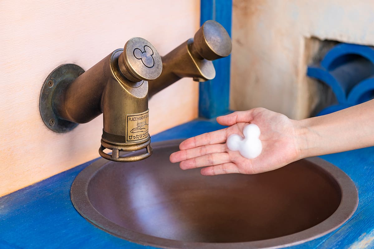 「ハンドウォッシングエリア」では、ミッキーシェイプの泡で、お子さまも楽しく手を洗える。