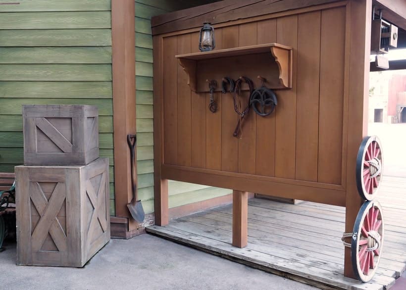 ④トレーディングポストは、ビッグサンダー鉱山までの駅馬車の停泊地となり、壁に馬具や車輪がかけられているのはそのため。