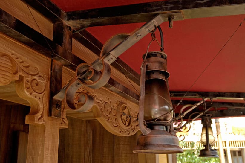 ⑤屋外ダイニングエリアには、馬をつなぐための杭が気の通路に沿って並び、そばには馬に水を与えるための手動のポンプのついた木箱が置かれている。