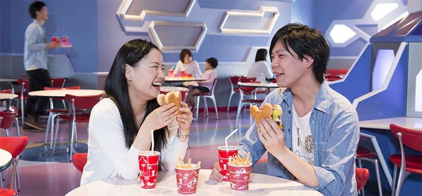 カウンターサービスのミッキーシェイプのハンバーガーなどファーストフードを扱うレストラン