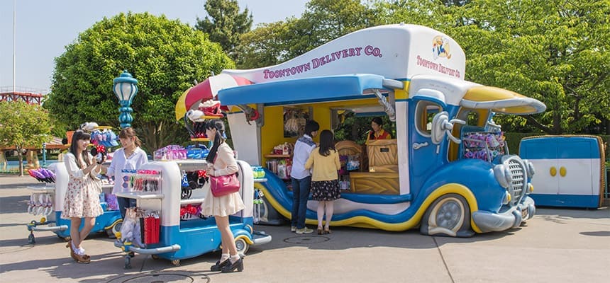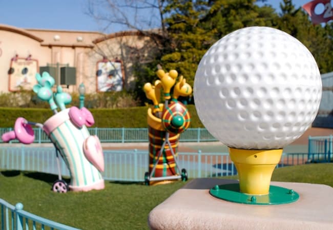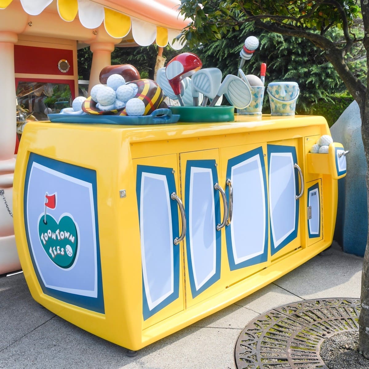 ③トゥーンタウンにあるゴルフ場の近くにあるので、ワゴンの横にはゴルフクラブやゴルフボールがディスプレイされている。