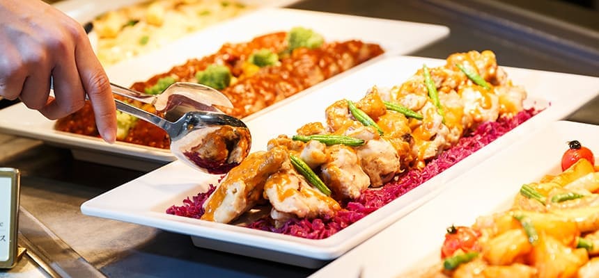 ③ふしぎの国の料理やユニークなデザートなどバラエティ豊かなメニュー。
