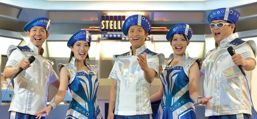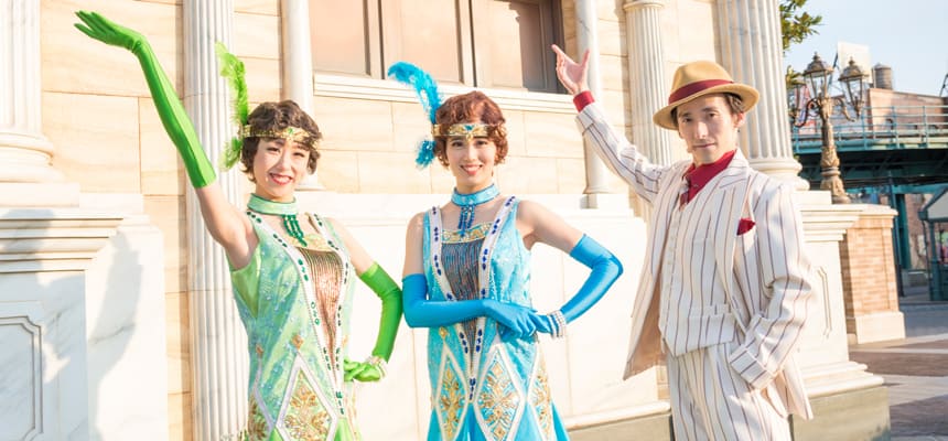 アトラクションやイベントのバックグラウンドストーリー、見どころを音楽やパントマイムを交えて紹介する3人組。