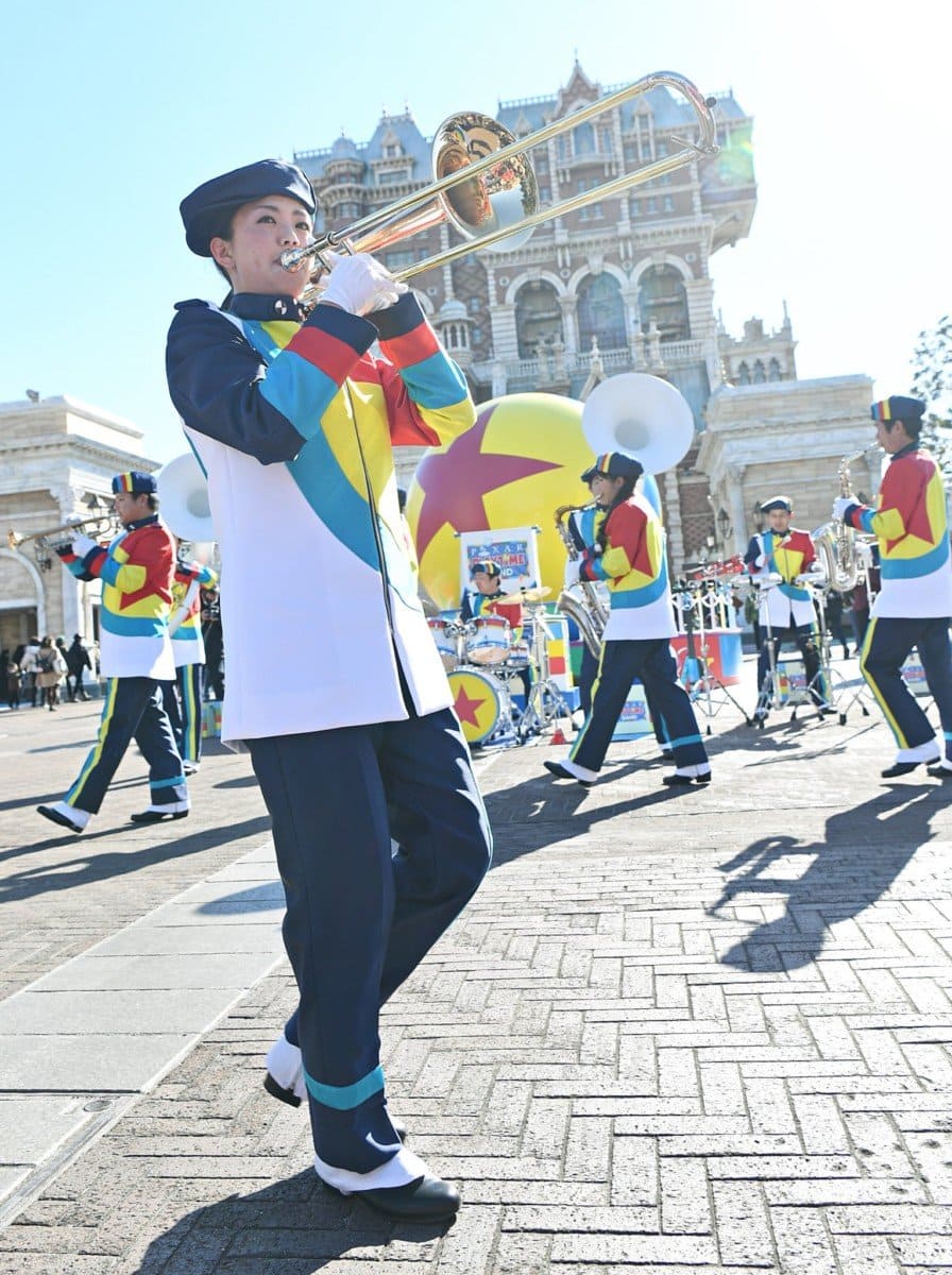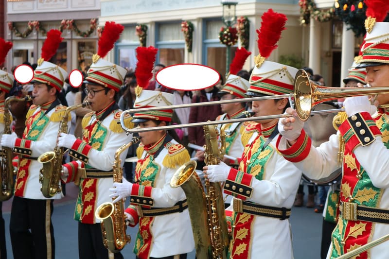 赤い帽子と上着に白いスラックスという衣装を身に纏った、東京ディズニーランドの吹奏楽団。