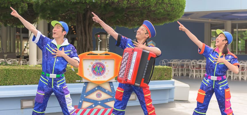 アトラクションやイベントのバックグラウンドストーリー、見どころを音楽やパントマイムを交えて紹介する3人組。