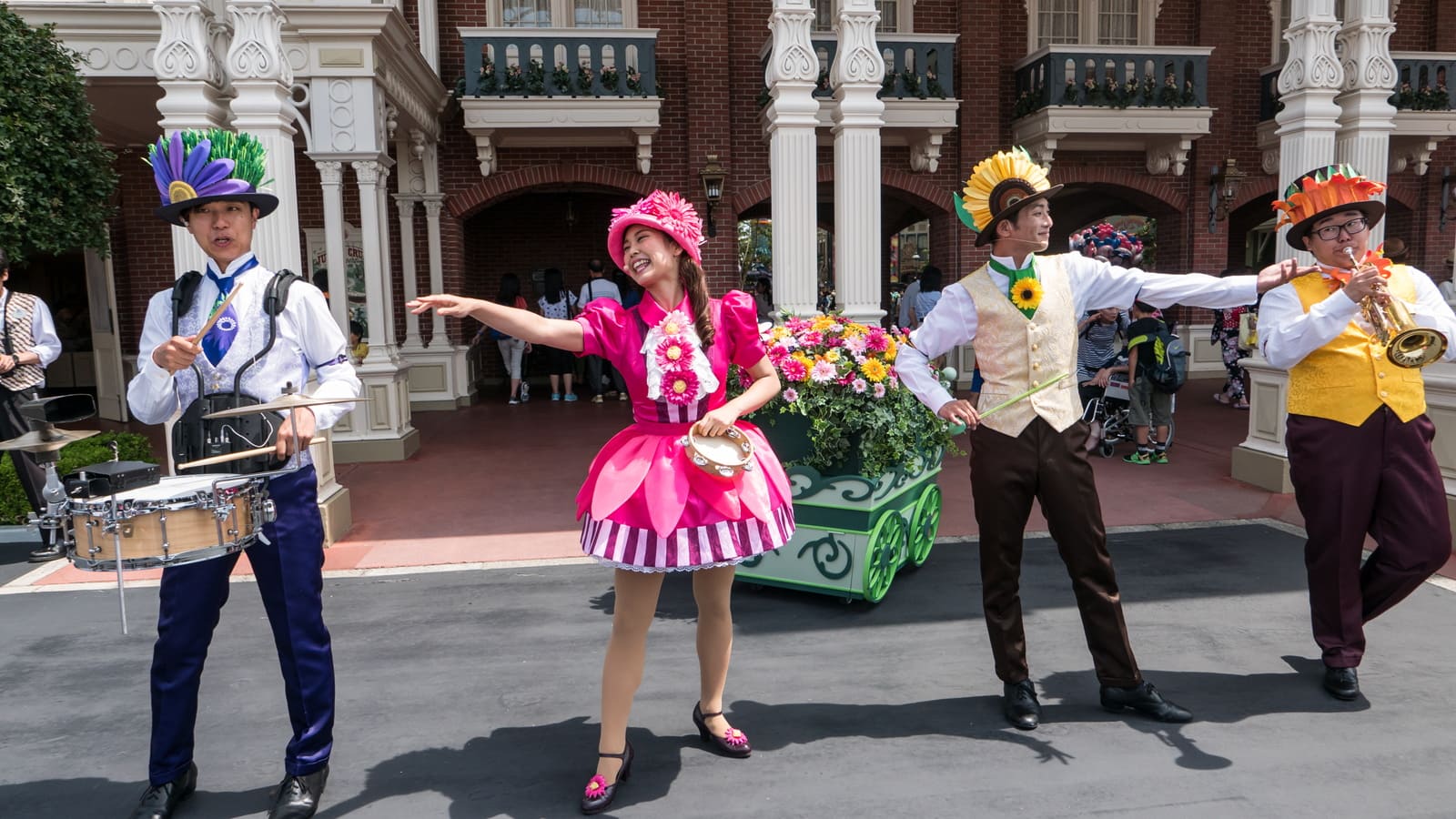 花をあしらった衣装を着た4人組が、音楽に乗せてパーク内に咲いている四季折々の花を紹介する。