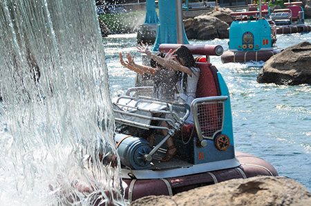 3人乗りのウォータービークルに乗り込み、渦巻きや間欠泉、滝などが点在する迷路のようなコースを進む。