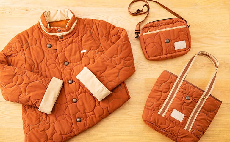 コートの生地やボタンを使用した「トートバッグ」と「ショルダーバッグ」で、キルティング生地のミッキーシェイプのステッチは5色あり、商品によって1つ1つ見える色が異なる。