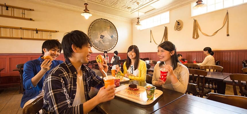 カウンターサービスのショーを見ながらハンバーガーなどの食事ができるレストラン