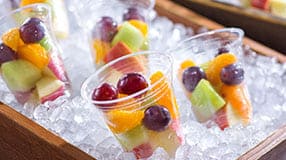 ②サンライズをイメージした、朝焼けのような淡いオレンジ色のソフトドリンクや、サンセットをイメージした、陽が沈むころの赤く染まった空のようなアルコールドリンクを販売している。