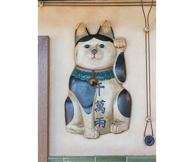 ⑦レジの近くには大きな招き猫が壁にあり、左手は”人”を招くと言われており、たくさんの人に訪れてほしいというオーナーの思いが込められている。