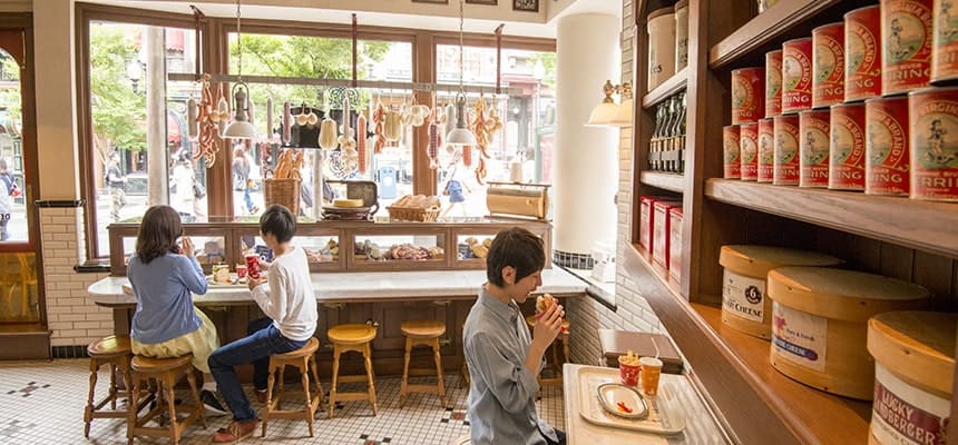 ①コンセプトは、20世紀初頭の劇場街、ニューヨーカーたちに人気のデリカッセン(軽食を販売するお店)。