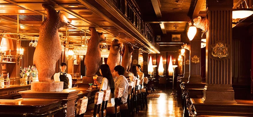 ⑤4頭の木彫りのクマがいるバーカウンターは、ルーズヴェルトが自然保護政策に関わった熱心な自然派志向の人物だったことを反映。